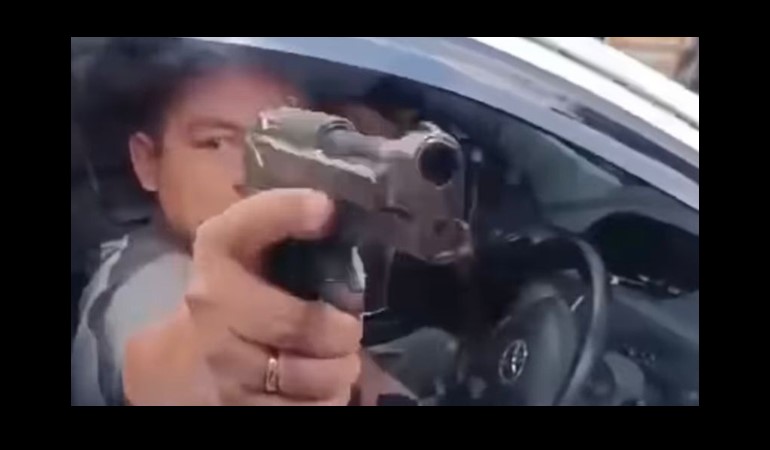 Dalam video tersebut, pelaku menghendarai mobil Etios berwarna putih dan menodongkan benda menyerupai senjata api (senpi) ke pengendara lain.