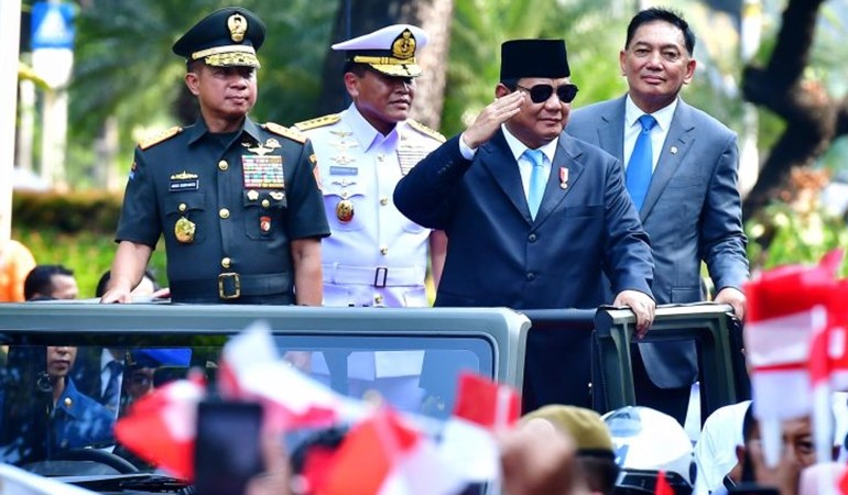 Presiden Prabowo kemudian meninggalkan lokasi menuju Istana dengan menggunakan kendaraan Maung, diiringi oleh drumband dan para pegawai Kementerian Pertahanan yang berdiri di sepanjang jalan sambil membawa bendera Merah Putih.