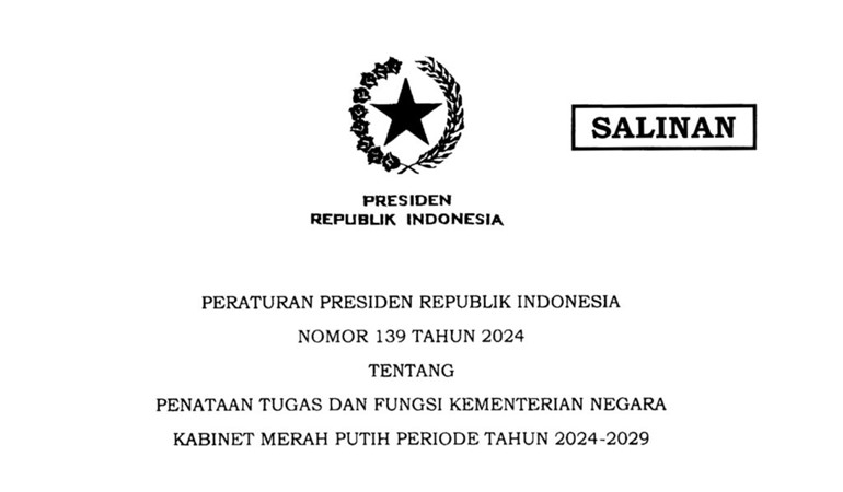 BERITAUP2DATE.COM, Pada tanggal 21 Oktober 2024, Presiden Prabowo Subianto mengeluarkan Peraturan Presiden Republik Indonesia (Perpres) Nomor 139 Tahun 2024 tentang Penataan Tugas dan Fungsi Kementerian Negara Kabinet Merah Putih Periode Tahun 2024-2029.